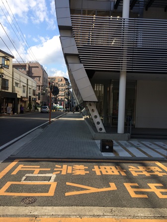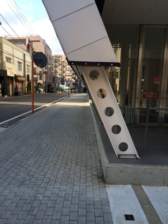 歩道に覆いかぶさってくる様な外壁は、視覚障がい者にとってバリアが発生します。