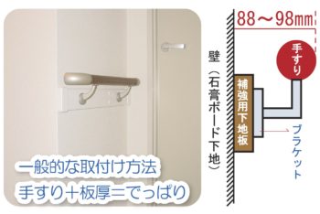 一般的な手すりの取付け方法。手すり+補強用下地板厚=でっぱりが大きい