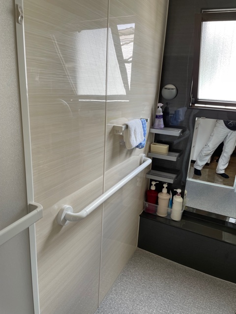 リフォーム後は床に滑り防止のシートを貼り、壁はお掃除が簡単なパネルを張りました。手すりも付けたのでこれからは快適、安全に入浴ができます。
