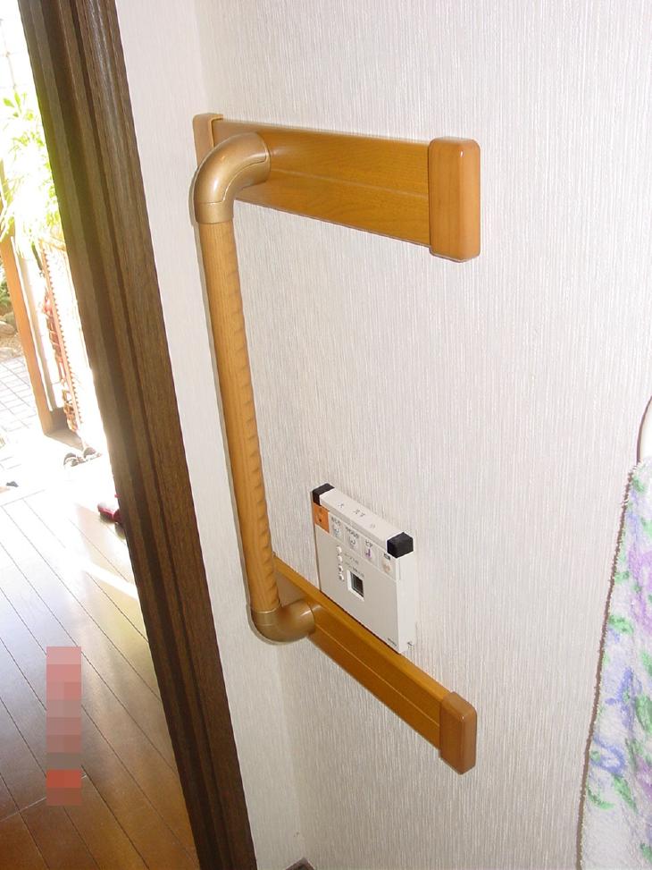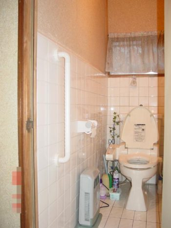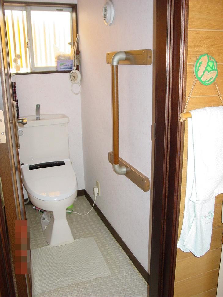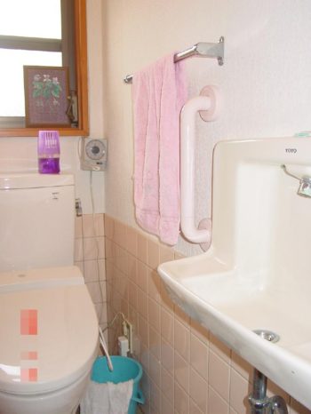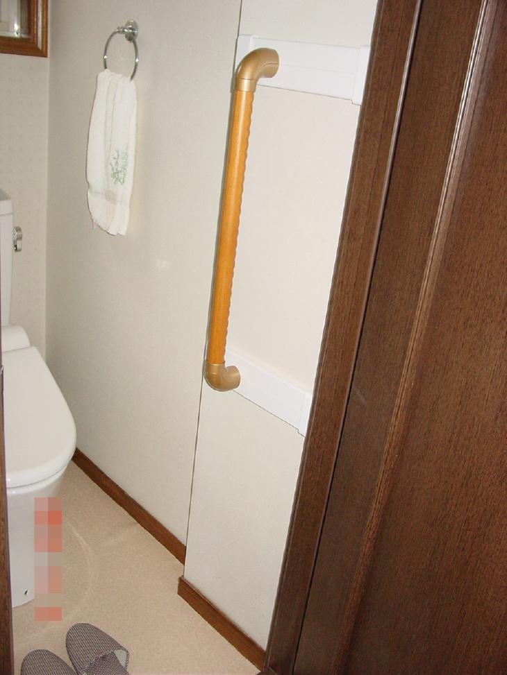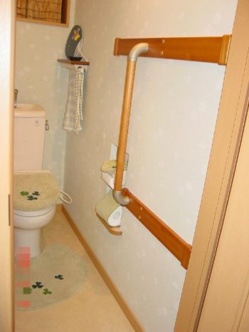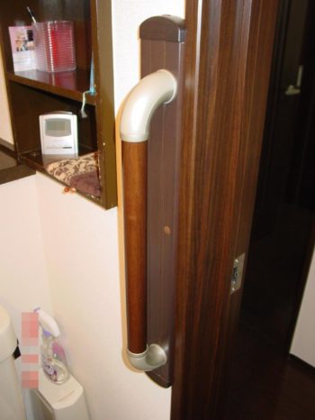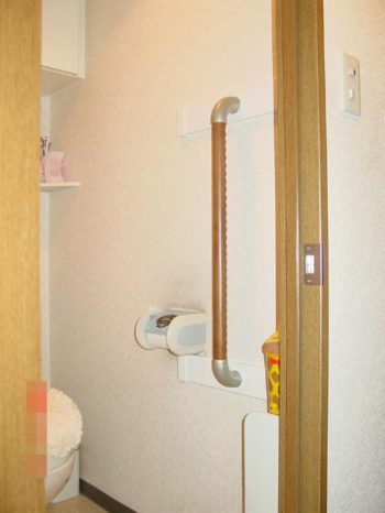 多くのトイレには扉の脇に袖壁があり、袖壁側に手すりを配置する事でトイレ出入口の有効開口寸法を広く確保する事が出来ます。もちろん身体状況に応じたプランニングが最優先です。