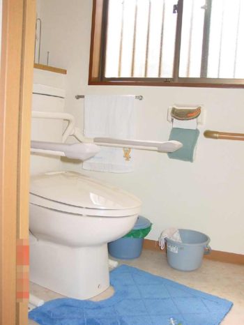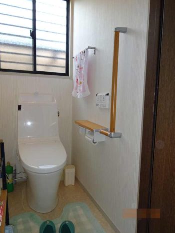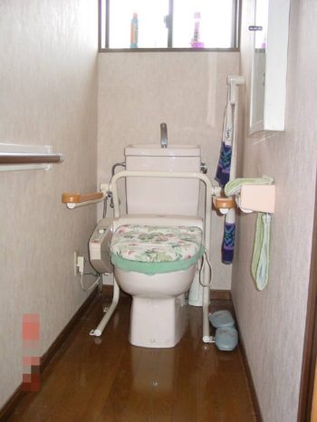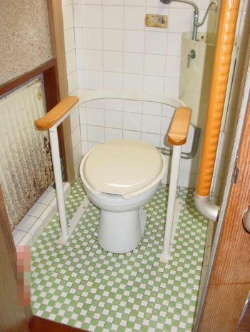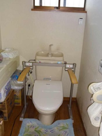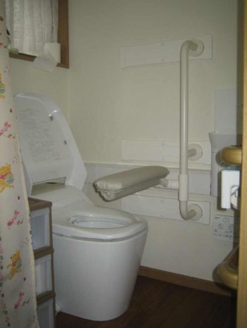 床固定式トイレ専用手すり。肘掛けの様な木製手すりを利用して便器からの立ち座りをサポート