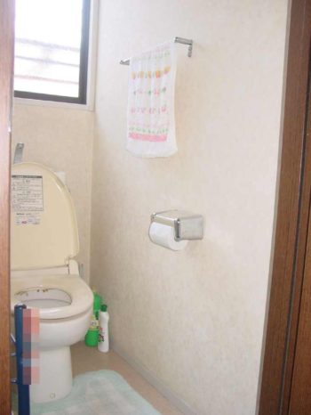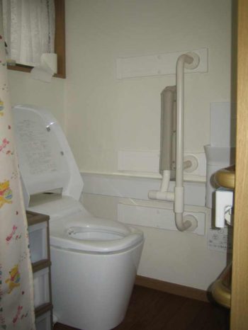 床固定式トイレ専用手すり。木製手すりをはね上げる事が出来るので掃除の際は便利!