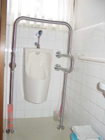 床固定式トイレ専用手すり。一般的な壁付手すりに比べ、身体に近い位置に支えがあり力が入りやすい。