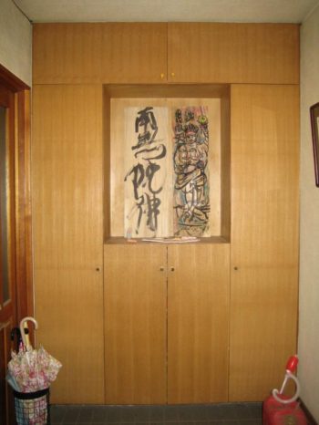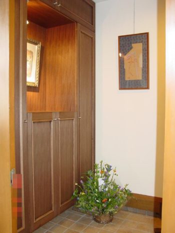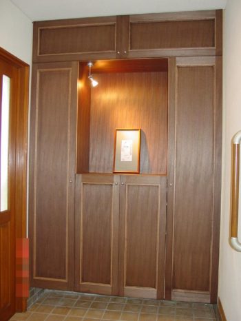 下駄箱もウォールナット色を塗りスポットライトも取り付け、飾りに明かりを灯す事が出来る用になりました。