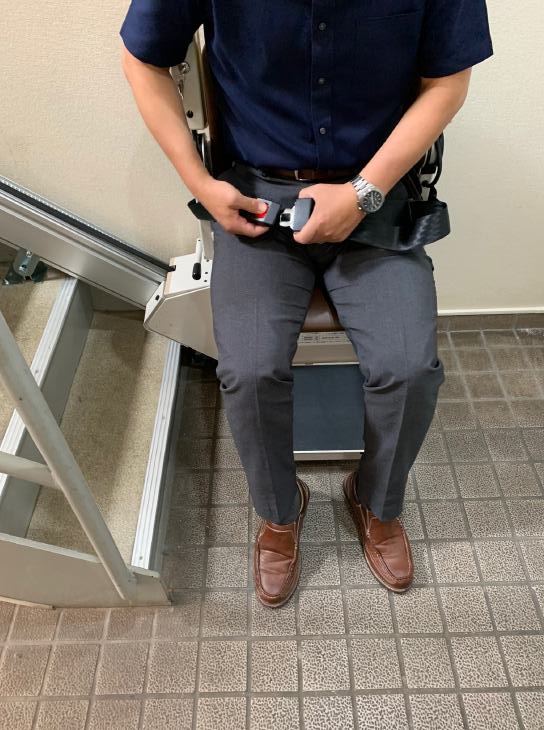 階段昇降機は家庭用コンセントを利用します。昇降機が別階にあってもリモコンで呼び出し可能