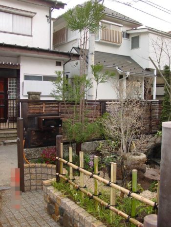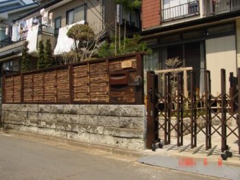 既存のフェンスの支柱を活かし、黒竹の垣根を作りました。