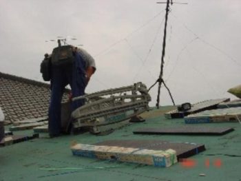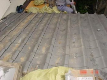 下屋根(1階の屋根)の瓦も同様に剥がしていきます